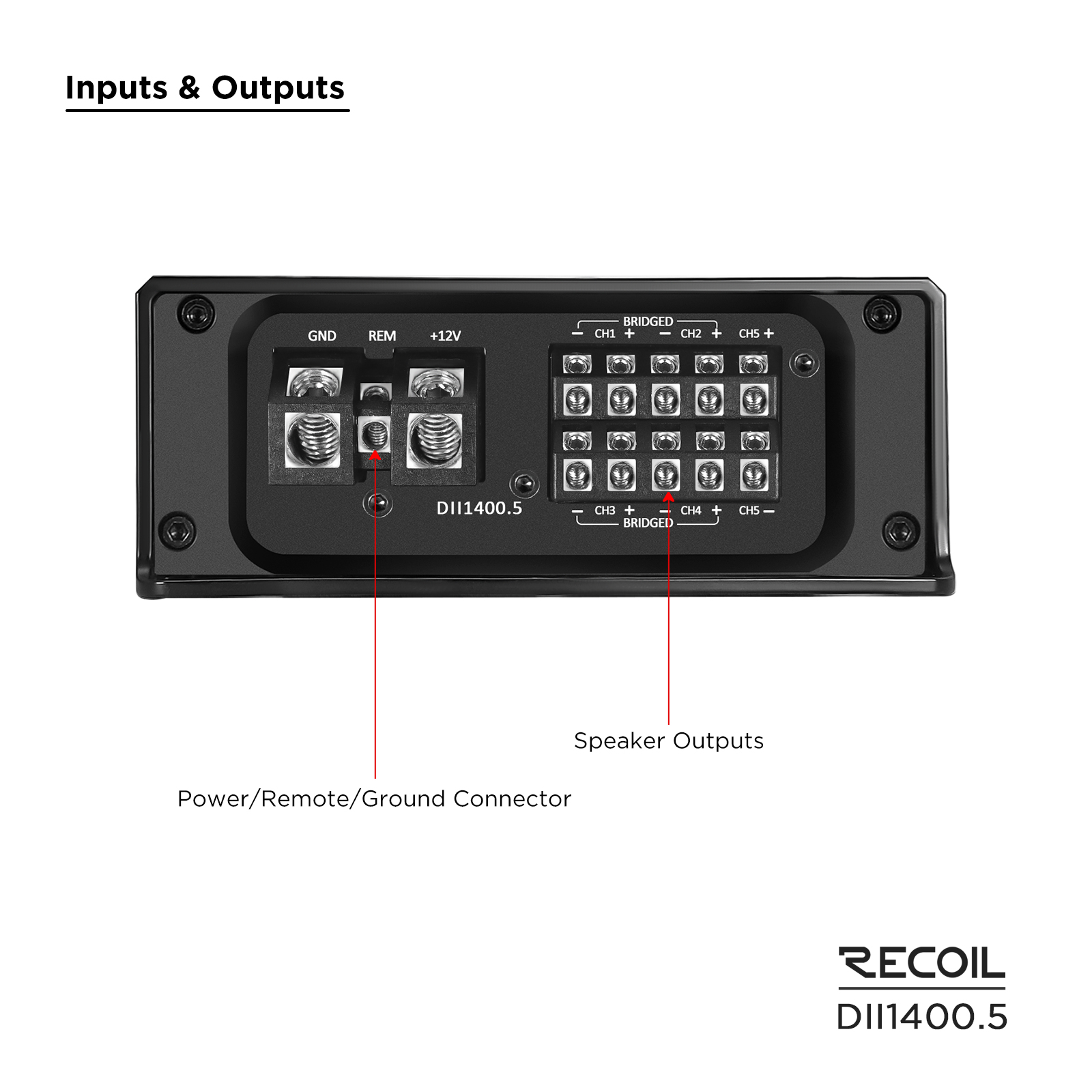 Niewielkie rozmiary wzmacniaczy serii Recoil DII mogą budzić obawy, które zostają rozwiane w chwili podłączenia do systemu audio. Wykorzystując najnowsze technologie klasy D, te ultrakompaktowe wzmacniacze serii DII zostały zaprojektowane tak, aby dostarczać ogromną moc wyjściową audio z niesamowitą wydajnością i ponadprzeciętną jakością. Dla Twojej wygody elementy regulacyjne wzmacniaczy DII znajdują się na górze wzmacniacza, pod płytką tabliczką.