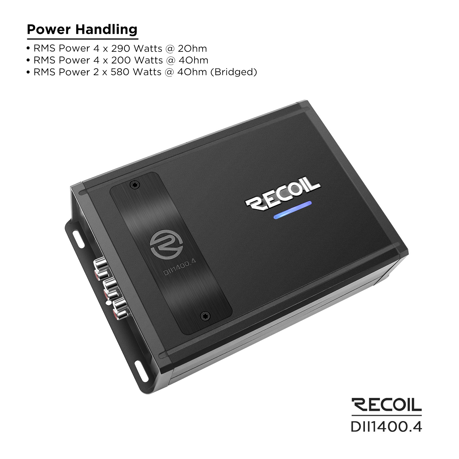 Niewielkie rozmiary wzmacniaczy serii Recoil DII mogą budzić obawy, które zostają rozwiane w chwili podłączenia do systemu audio. Wykorzystując najnowsze technologie klasy D, te ultrakompaktowe wzmacniacze serii DII zostały zaprojektowane tak, aby dostarczać ogromną moc wyjściową audio z niesamowitą wydajnością i ponadprzeciętną jakością. Dla Twojej wygody elementy regulacyjne wzmacniaczy DII znajdują się na górze wzmacniacza, pod płytką tabliczką.