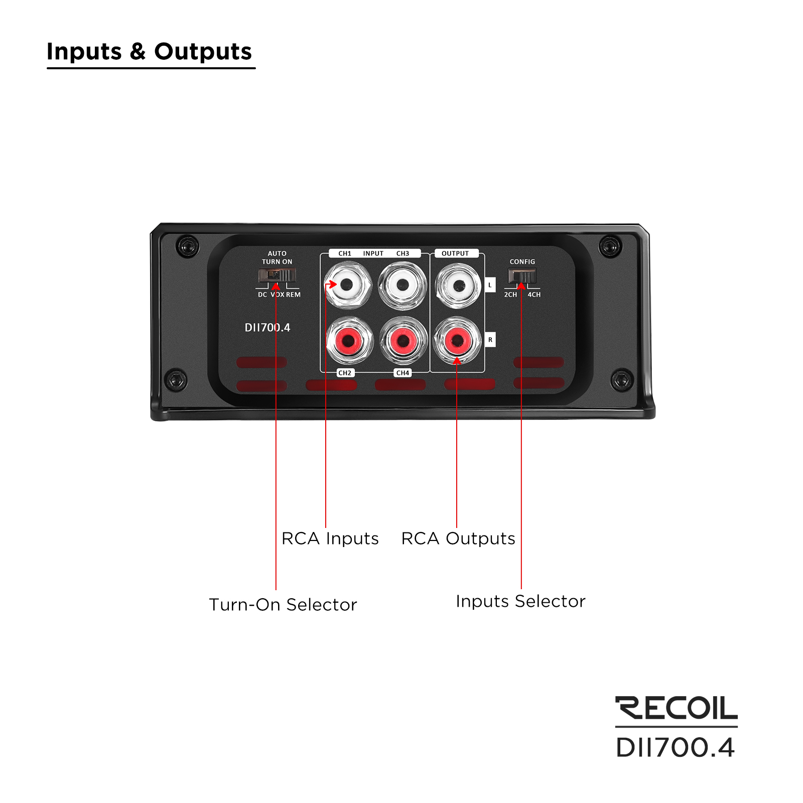 Niewielkie rozmiary wzmacniaczy serii Recoil DII mogą budzić obawy, które zostają rozwiane w chwili podłączenia do systemu audio. Wykorzystując najnowsze technologie klasy D, te ultrakompaktowe wzmacniacze serii DII zostały zaprojektowane tak, aby dostarczać ogromną moc wyjściową audio z niesamowitą wydajnością i ponadprzeciętną jakością. Dla Twojej wygody elementy regulacyjne wzmacniaczy DII znajdują się na górze wzmacniacza, pod płytką tabliczką.